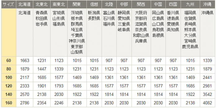 下記は大阪から発送した場合の運賃(ヤマト運輸 HPより)の目安です。