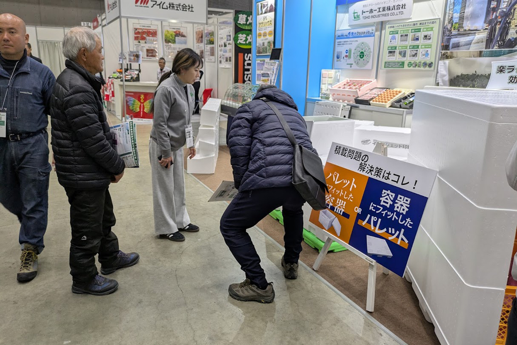 当社ブースでは、昨今の物流問題の解決につながる「EPSユニークパレット(専用パレット)シリーズなどに熱心にご質問いただいております。