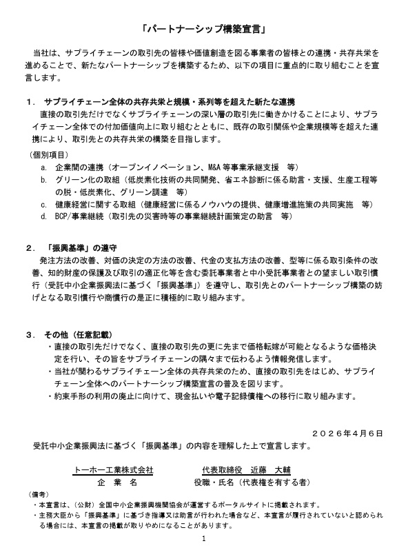 このたびトーホー工業株式会社は、内閣府・中小企業庁などが推進する、サプライチェーン全体の共存共栄と新たな価値創造を目指す「パートナーシップ構築宣言」の趣旨に賛同し、宣言を公表いたしました。
